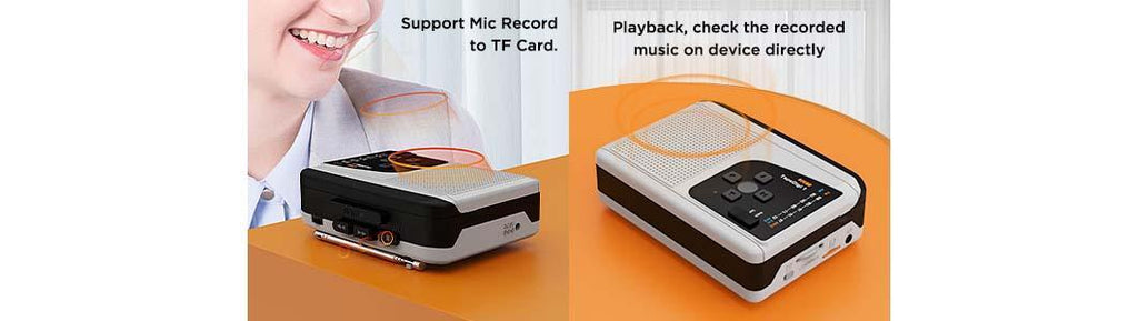 Vår kassettspelare är utrustad med en 1W stor högtalare som enkelt kan fylla ett rum med bra stereoljud. Denna radiokassettspelare har även ett 3,5 mm hörlursuttag som du kan ansluta dina hörlurar till för att undvika att bli störd när du lyssnar. Den stöder också röstinspelningsfunktion, inspelning via den inbyggda mikrofonen från den externa rösten till TF-kortet